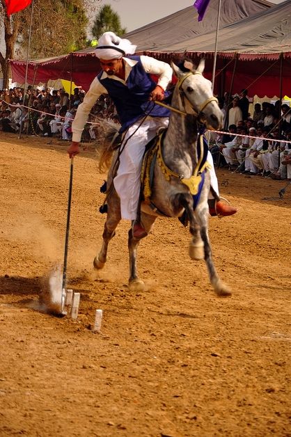 During the Jashn-e-Baharan, the Spring Festival, the tent pegging is a must event - wherein horsemen, usually farmers, after a sucessful harvesting, show their feat of fine horsemanship and tent pegging. The sport of tent pegging is mostly played in the Punjab province, and teams from Lahore, Gujranwala, Faisalabad, Rawalpindi and Atoock are famous for the mastery in the sport of tent pegging. Once the famous Horse and Cattle Show held at Fortress Stadium Lahore was one such grand festival where besides many feats by the military police motorcyclists and bands, tent pegging was a regular feature. Now this festival is also part of many other cities during the annual Cattle Market or Mela Maweshian.